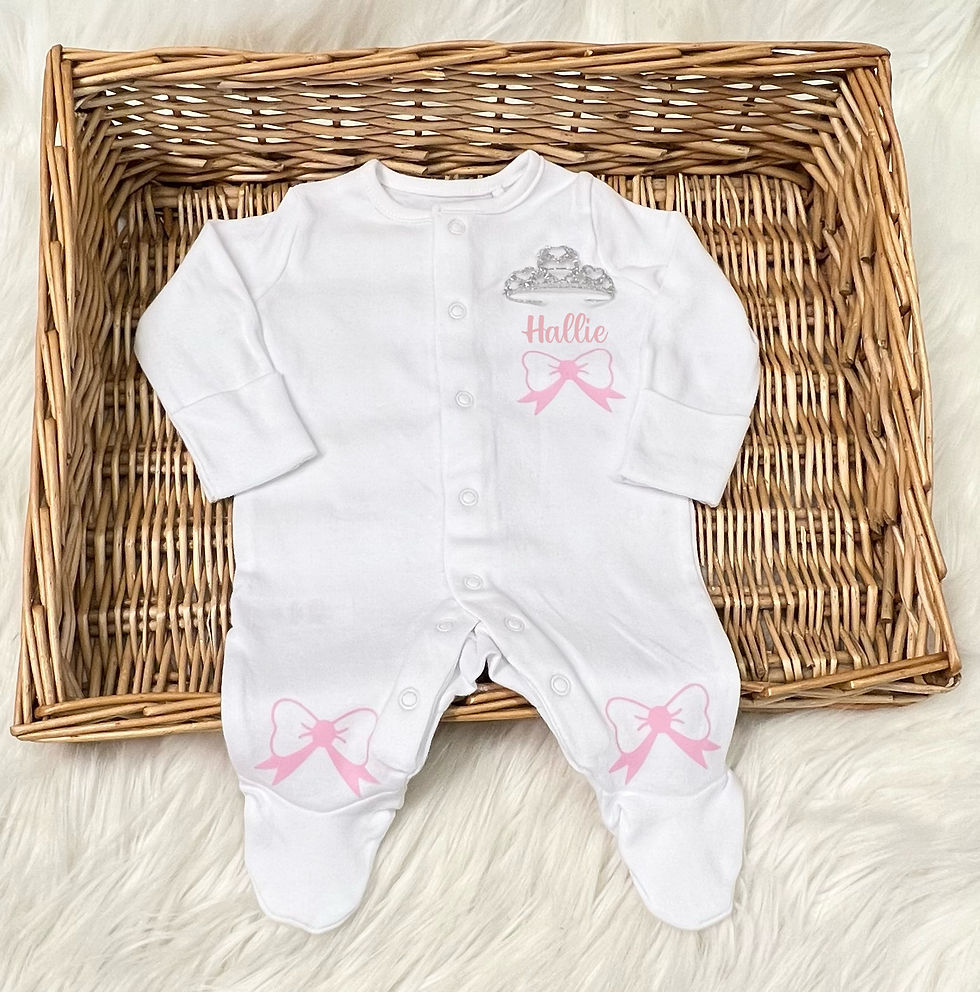 Personalised sleep suit hat scratch, mitts, any FREE character bows