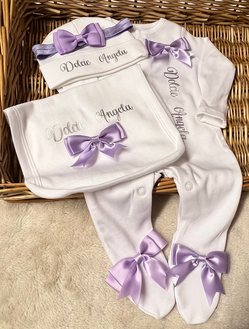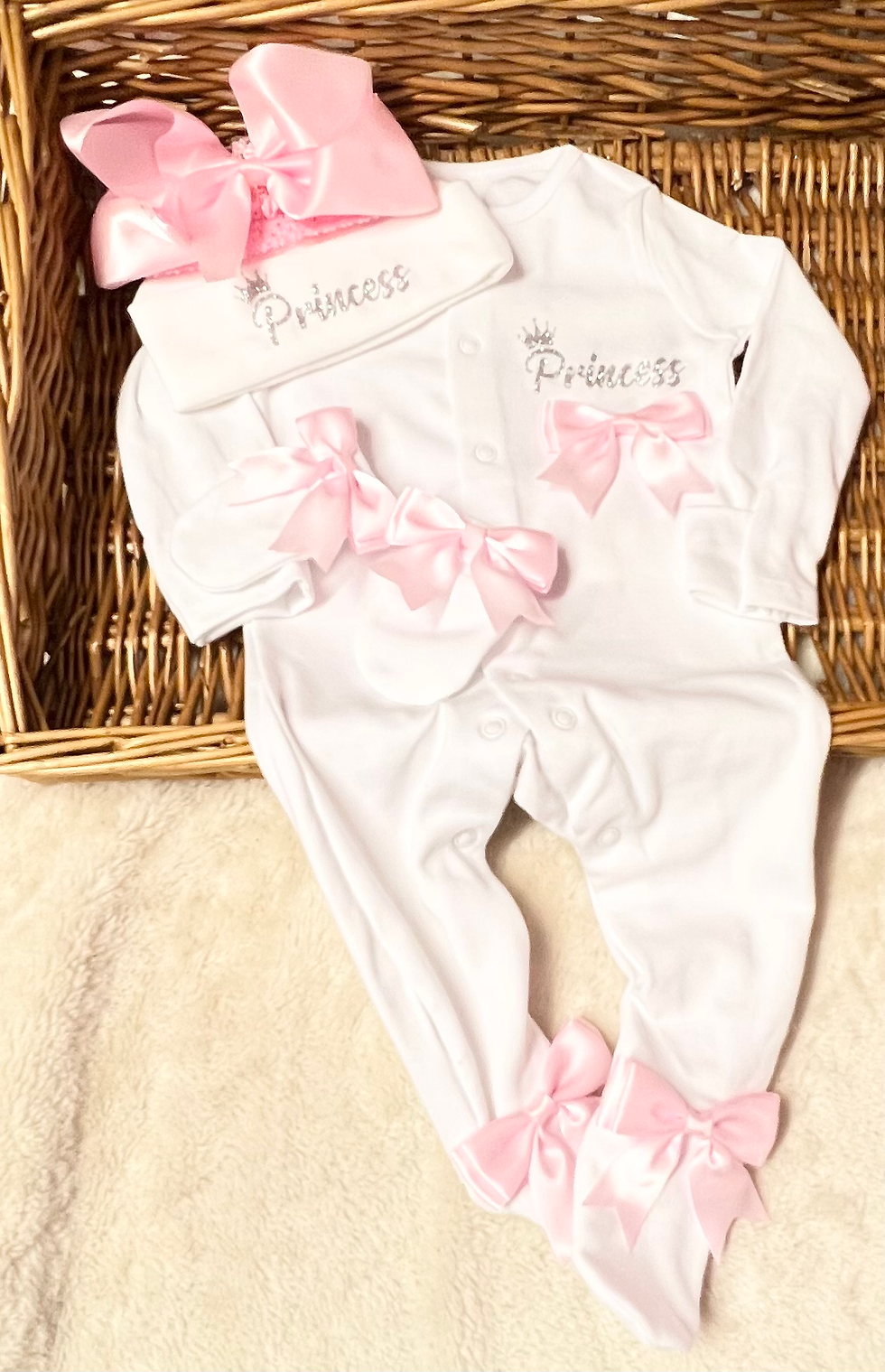 Baby homecoming SLEEPSUIT set with bows FREE hat & HEADBAND