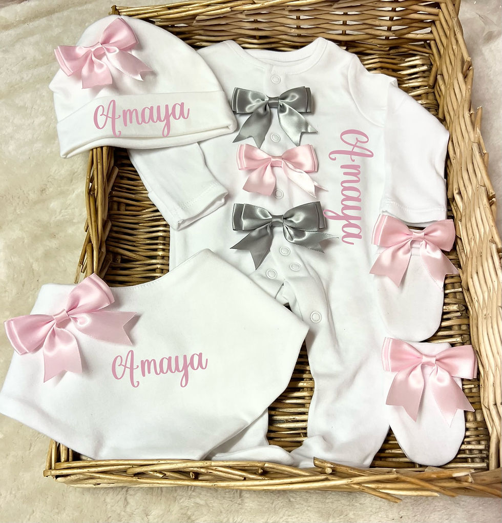 Baby homecoming SLEEPSUIT set with bows FREE BIB